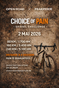 Am 2. Mai 2026 laden OPEN ROAD und PEAKMODE zu einer Gravel-Ausfahrt der anderen Art ein. Keine Platzierungen, kein Zeitdruck. Stattdessen: lange Distanzen, viele Höhenmeter und die ehrliche Frage, wie weit du heute gehen willst.